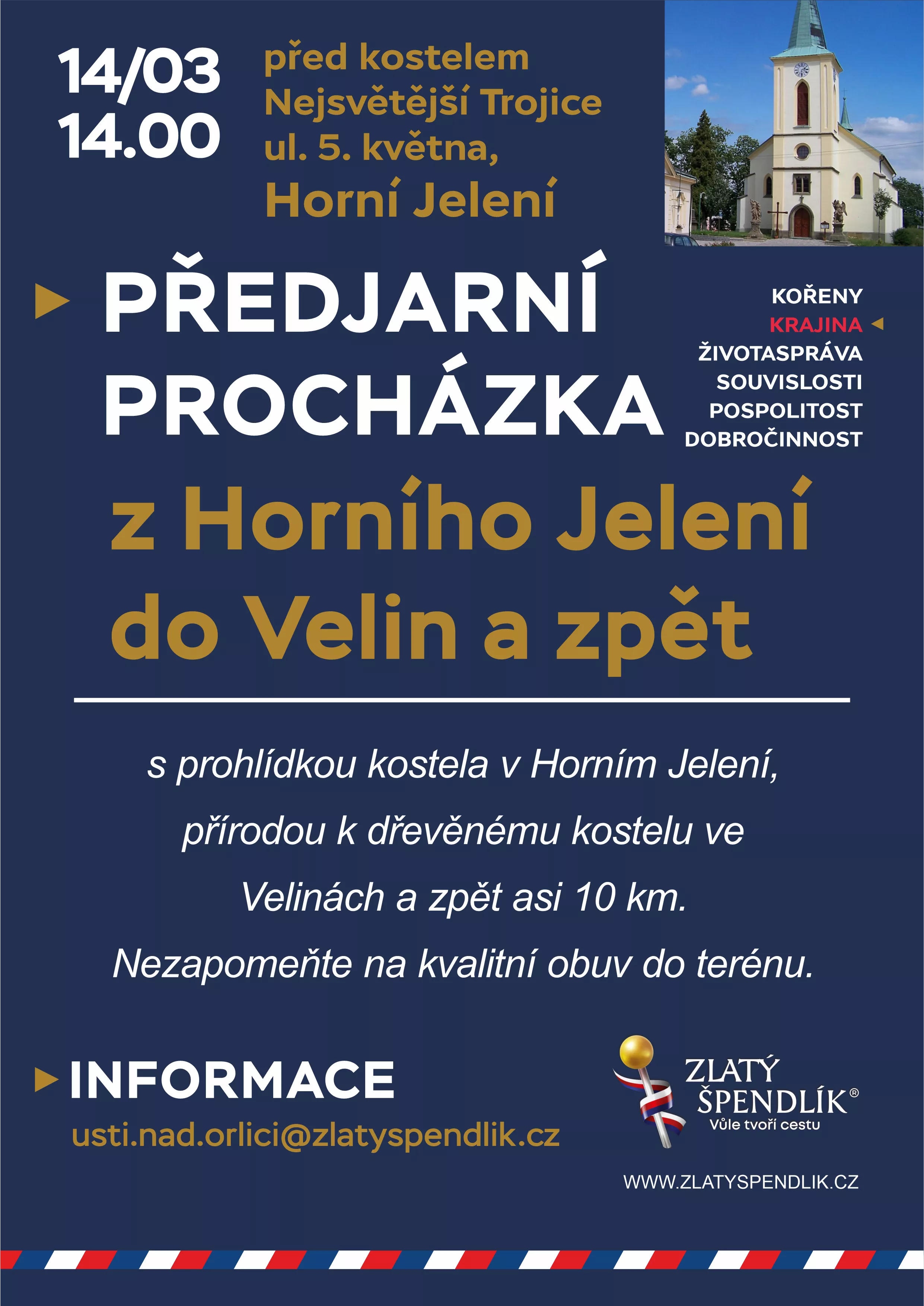 Procházka s prohlídkou kostela v Horním Jelení, přírodou k dřevěnému kostelu ve Velinách a zpět asi 10 km.